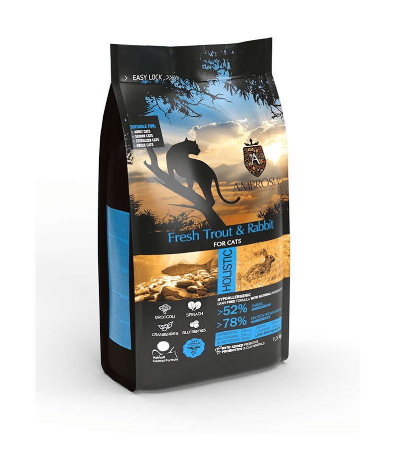 Ambrosia Teraviljavaba täistoit Värske Forelli ja Küülikulihaga täiskasvanud kassidele, kõikid tõud.