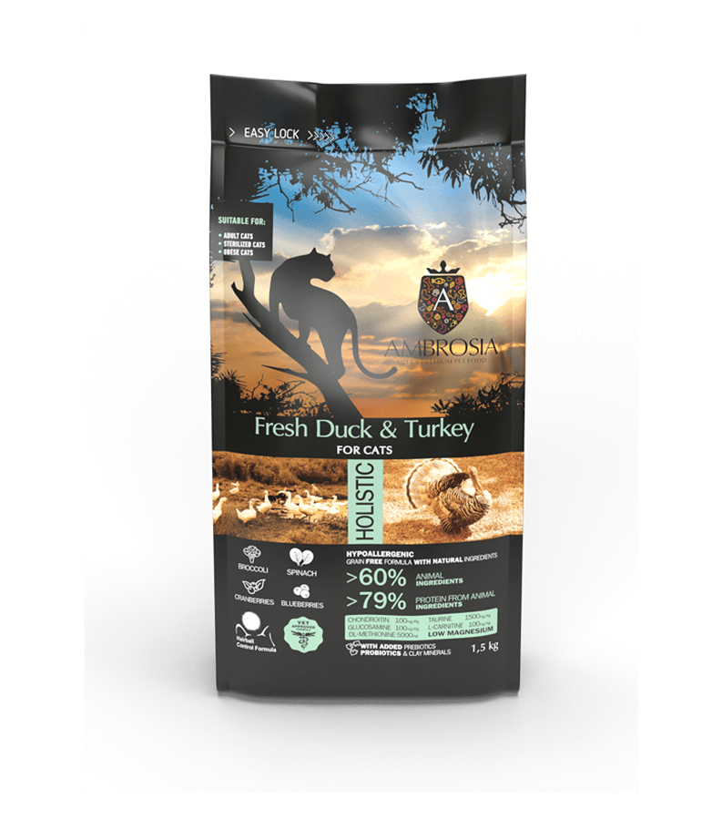 Ambrosia Teraviljavaba Täitoit Värske Pardi ja Kalkunilihaga täiskasvanud kassidele, kõik tõud.