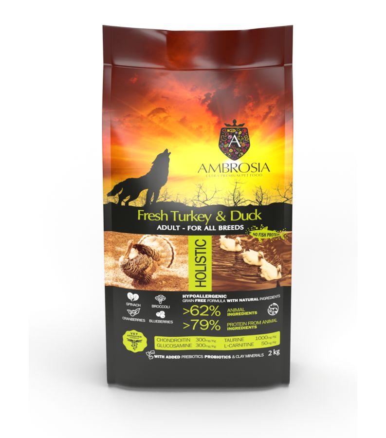 Ambrosia Värske Kalkun ja Part retsept ühendab kahe linnuliha valguallikad, mis pärinevad värskest kalkuni- ja dehüdreeritud pardifileest. Toit sisaldab prebiootikume ja probiootikume seedimise ja immuunsüsteemi parandamiseks, kondroitiini ja glükoosamiini liigeste kaitseks ning tauriini ja L-karnitiini südame-veresoonkonna ja lihaste süsteemi tugevdamiseks. Värske kalkuni- ja pardiliha retseptis on keskmise suurusega graanul, mis sobib ideaalselt kõikidele koeratõugudele.