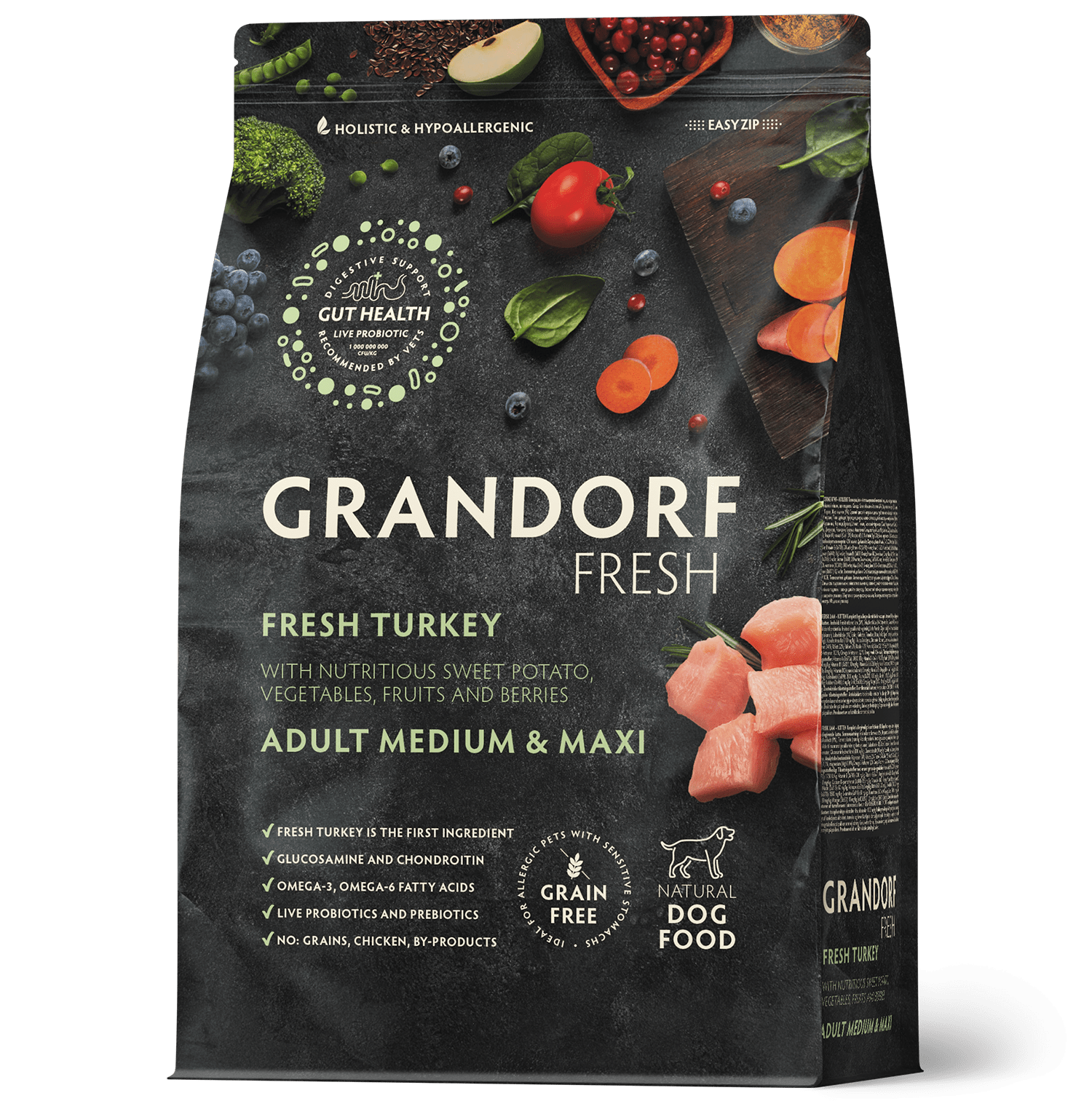 Teraviljavaba toit elusate probiootikumidega. Eriti allergilistele keskmist kuni suurt tõugu tundliku seedimisega koertele. Värske hüpoallergeenne ja toitev kalkuniliha on kasulik koera seedesüsteemile. Tänu monoproteiini retseptile, hüpoallergeensetele koostisosadele, teravilja- ja gluteenivabale koostisele koos elusate probiootikumidega on toit suurepärase seeduvuse, kõrge toiteväärtusega ning aitab teie lemmikloomal püsida terve ja õnnelik paljude eluaastate vältel.