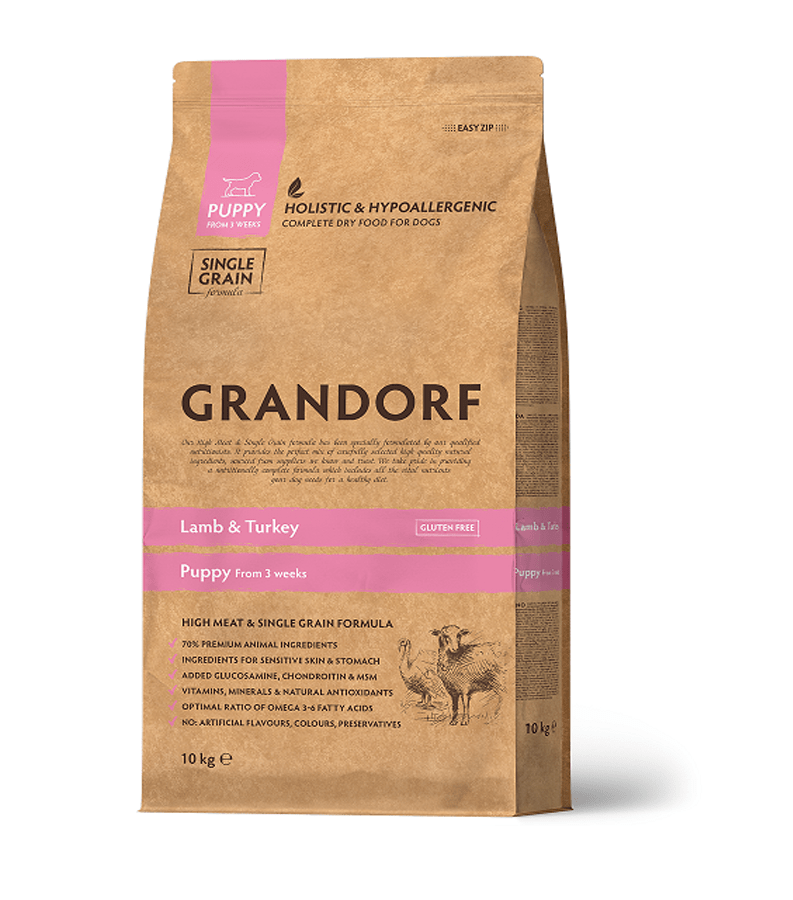 Grandorf Lambaliha ja Kalkuniliha Täistoit Kutsikatele alates kolmandast elunädalast ning tiinetele ja imetavatele koertele. Koosneb hoolega valitud hüpoallergilistest koostisosadest, mis aitavad ennetada allergilisi reaktsioone ja toidutalumatusi, tugevdades samal ajal immuunsüsteemi ja seedimist. Kõrge vajalike valkude, tervislike rasvade, aminohapete ja vitamiinide sisaldus garanteerib kutsikale terve ja loomuliku arengu.