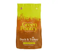 Green Pantry Duck with blueberry & nettle – teraviljavaba, 100% keemiavaba täissööt igas vanuses koertele sünnist surmani pardi-ja kalkunilihaga. Nii pardi-kui kalkuniliha on kerge seedida ning seda toitu saavad seetõttu süüa ka väga nõrga seedimisega koerad. Maguskartul ei tekita gaase ning kõrvetisi. Toit ei sisalda kanaliha ega kanarasva!