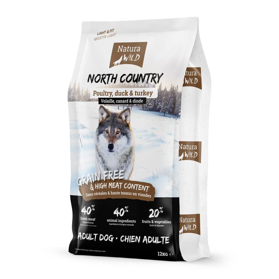Natura Wild North Country täissööt täiskasvanud koertele, mis sobib kõikidele tõugudele, aga eriti suurtele koertele tänu oma vähendatud valgu- ja rasvasisaldusele ning suuremale graanulile. See retsept sobib ka ülekaalulistele või steriliseeritud koertele.