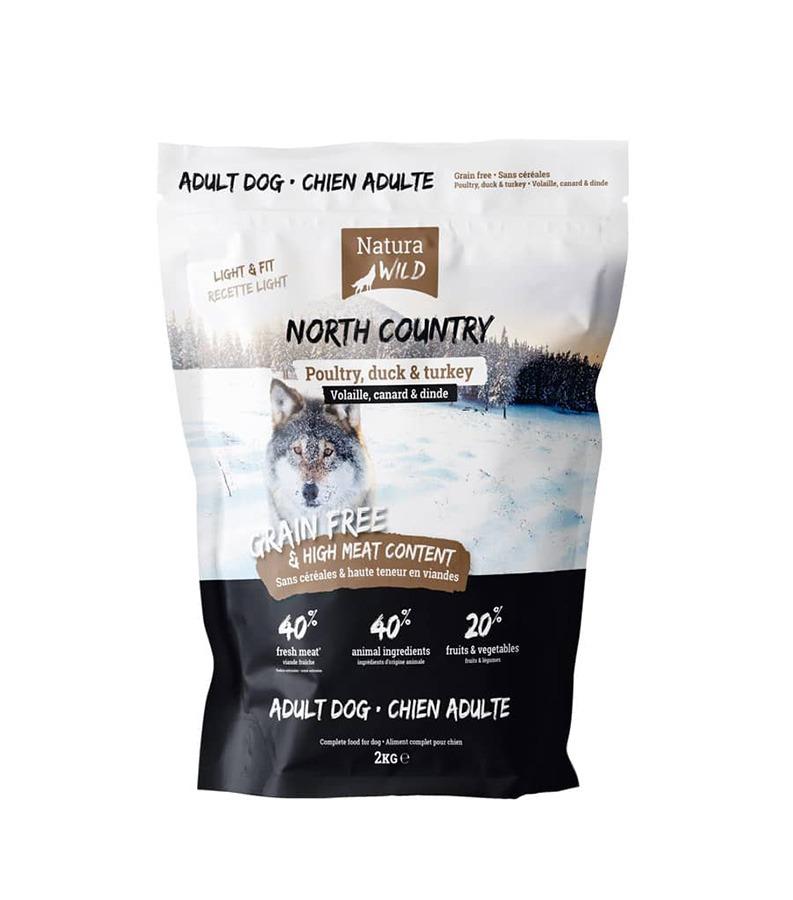 Natura Wild North Country täissööt täiskasvanud koertele, mis sobib kõikidele tõugudele, aga eriti suurtele koertele tänu oma vähendatud valgu- ja rasvasisaldusele ning suuremale graanulile. See retsept sobib ka ülekaalulistele või steriliseeritud koertele.