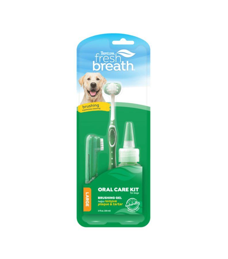 Üle 80% koertel hakkavad ilmnema erinevad suuhügieeniprobleemid kolmandast eluaastast. Seda on võimalik ennetada hambakatu ning hambakivi tekitavate bakterite kontrolli all hoidmisega. TropiClean Fresh Breath suuhoolduskomplekt suurtele koertele sisaldab TripleFlex hambaharja, sõrmeharja ja hambapuhastusgeeli 59ml. TripleFlex hambahari puhastab 360-kraadiste harjastega 3 korda kiiremini, kui tavaline hambahari. Lisaks kaasas sõrmhari. Toode on 99,2% looduslik, piparmündimaitseline.